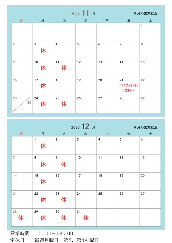 11月21日の営業時間は12時~18時となります。ご迷惑をおかけいたしますがよろしくお願いいたします。